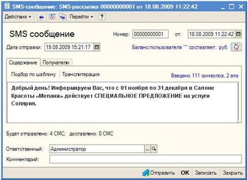 Рассылка SMS – с помощью этой функции Вы можете информировать клиентов салона о предстоящем посещении, скидках на определенные услуги, специальных предложениях и новостях, а также поздравлять с Днем Рождения или другими праздниками.