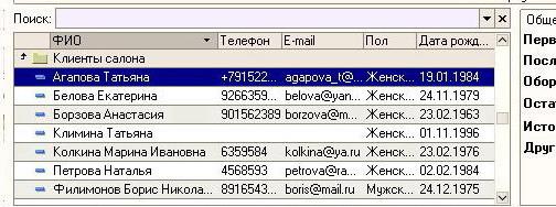 Окно клиенты салона – содержит список всех клиентов салона в алфавитном порядке (порядок расположения можно изменять).