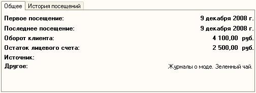 Сводная информация о клиенте – окно позволяет быстро получить общую информацию о клиенте. Здесь можно увидеть итоговую информацию по посещениям и финансовым операциям с клиентом, оценить остаток лицевого счета, индивидуальные предпочтения и пожелания. А также источник, по которому клиент пришел в салон (например по рекомендации друга). Это позволяет не задавать лишних вопросов клиенту и обеспечить максимально комфортный прием.