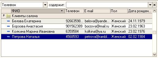 Панель быстрого поиска клиентов по ключевым полям – предназначена быстрого поиска клиента. С ее помощью возможен поиск клиента по фамилии, e- mail, телефону, дате рождения. Это облегчает работу администратору и сокращает время приема клиента