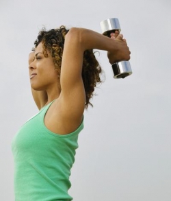 Упражнение № 1. Возьмите гантель, поднимите руку вверх, чтобы рука с телом образовала одну линию. Можно попробовать прислонится к стенке, для того, чтобы в процессе упражнения не нарушать линию. Аккуратно сгибаем в локте руку и опускаем ее за голову. Проделайте 15 раз одной рукой, и 15 раз второй.